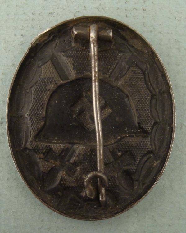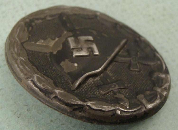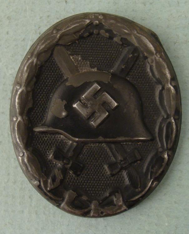 ORIGINAL NAZI BLACK WOUND BADGE-SHOWS HELMET/SWASTIKA & SWORDS * STAMPED OUT VERSION, WHICH IS CORRECT FOR THE BLACK (ONE) WOUND-WOUND BADGE