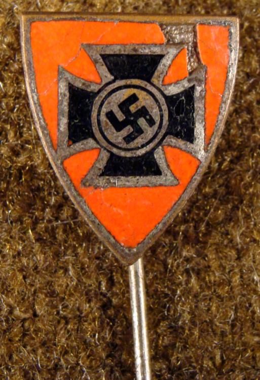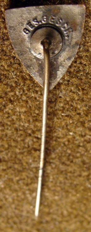 ORIG. NAZI IRON CROSS & SWASTIKA SHIELD STICKPIN-MARKED GES GESCH-RED/BLACK/SILVER * * KNURLED STICKPIN-ENAMEL DAMAGE