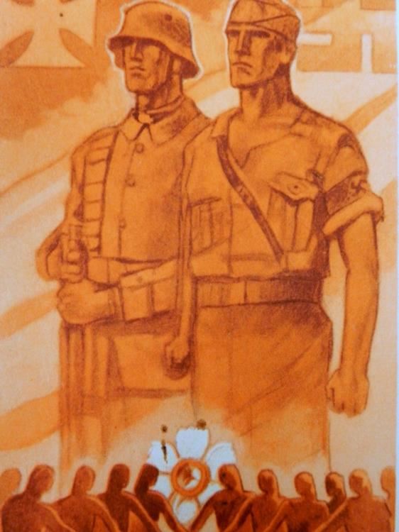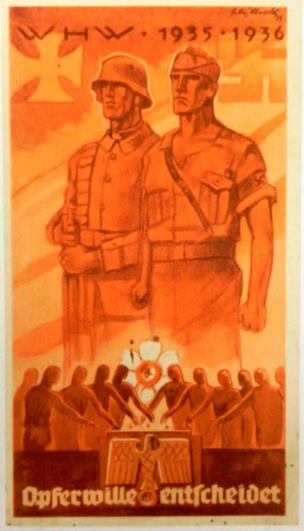 THIS IS AN ORIGINAL NAZI PROPAGANDA HANDBILL-WHW-1935-36 GREAT ARTWORK IN COLOR. IT IS 3X5.5"---SHOWS IRON CROSS--WHW 1935-1936 (DONATIONS FOR THE WAR EFFORT)--SHOWS TWO EARLY NAZI SOLDIERS IN UNIFORM-DONATORS BELOW-EAGLE & SWASTIKA AND READS "OPFERWILLE-ENTSCHEIDET"--GREAT RARE PIECE