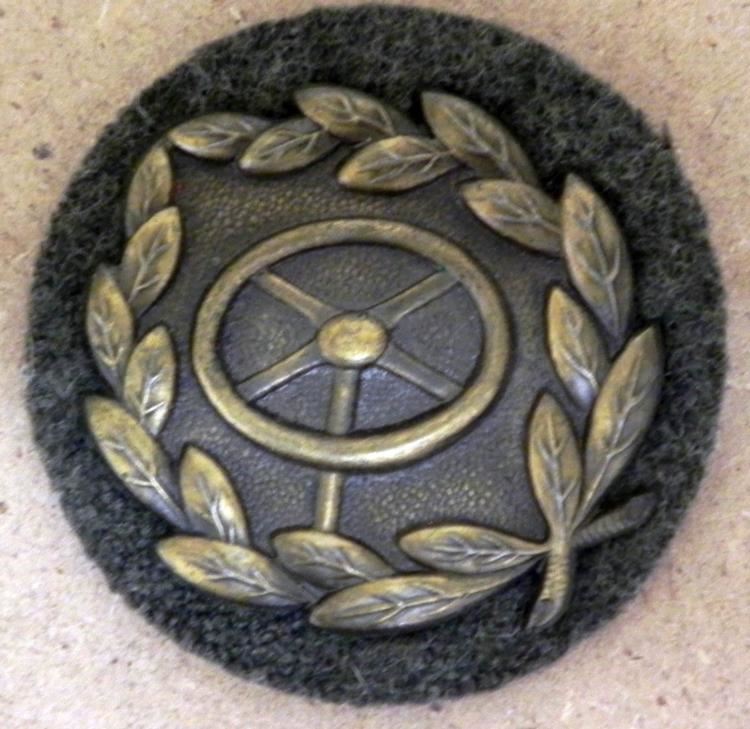 HERE IS AN ORIGINAL NAZI WEHRMACHT DRIVERS PROFICIENCY BADGE IN BRONZE. THIS IS A GREAT PIECE---WEHRMACHT DRIVER'S PROFICIENCY BADGE-UN-ISSUED-METAL WREATH AND STEERING WHEEL ON UNIFORM GREY FABRIC WITH THE BACK HAVING A TEXTURED LEATHER BACKING.