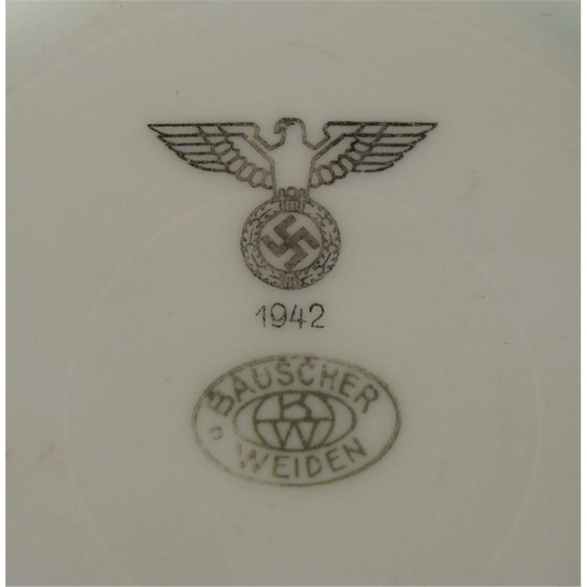 ORIGINAL NAZI WH WEHRMACHT ARMY WHITE MESS HALL SOUR KRAUT BOWL-1942 EAGLE/SWASTIKA * REVERSE MARKED WITH NAZI EAGLE & SWASTIKA -1942-BAUSCHER-WEIDEN AND LOGO--6" DIAMETER *