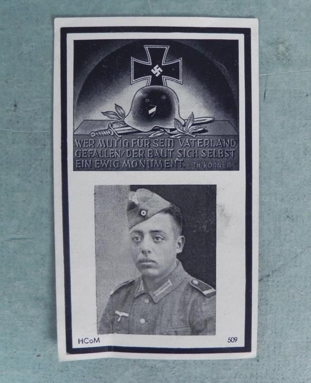 ORIG NAZI WWII FUNERAL CARD-W/PIC & IRON CROSS/HELMET-WEHRMACHT-KIA 1944 2 3/4 X 4 1/2"