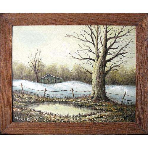 AN ORIGINAL OIL PAINTING OF A COUNTRY LANDSCAPE IN WINTER<p>A classically-styled landscape painting depicting a dreary winter scene in the country, created primarily in a color palette of various shades of gray. Leafless trees stand in a snow-covered country meadow. In the foreground lies a small frozen pond, a lone wooden country house in the snowy meadow separated from it by a worn country fence. <p>The artist has signed this work at lower left, 'M. Aiken'. Dimensions are 19.5 inches high by 23.5 inches wide, and condition is excellent. The painting is surrounded by a beautifully patinated, sand-blasted style of wood frame.