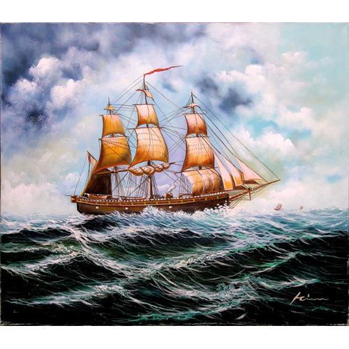 A dynamic oil painting of a giant schooner on very choppy high seas. All its sails are unfurled and filled with a strong wind. Skies are cloudy, and two additional ships can be seen in the distance. Fine detail, bright colors, and realistic imagery draw the viewer into this painting. The artist has signed this work at the lower right, 'Kim'. Condition is excellent, and the painting is on stretched canvas and unframed. Dimensions are 24" high by 27.75" wide.