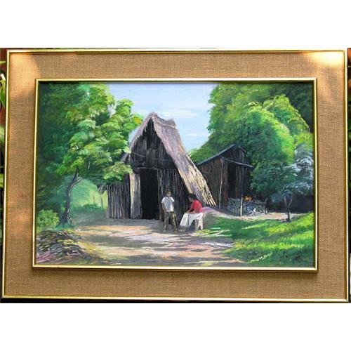 AN ORIGINAL OIL PAINTING OF A COUNTRY SCENE IN EL SALVADOR <P><BR>A colorful and charming bucolic scene of a clearing in a wooded area, with two people chatting in front of a thatched living hut. A second hand-built structure made of wood branches and thatch can be seen in the background with an open fire and barbecue pit in front of it.<p>The painting is oil on canvas board, in excellent condition. Overall dimensions are 16.3" by 22" framed, and the artist's signature appears at the lower right and reads, 'Rubio V. El Salvador, C.A./'79'. The frame appears to be gilt wood with burlap matting.