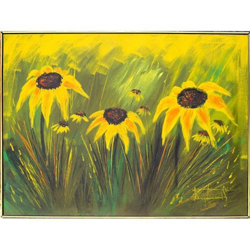 AN ORIGINAL OIL PAINTING OF A FIELD OF BLACK-EYED SUSAN FLOWERS<P>An original oil painting created in the 1960's or 1970's of a field of black-eyed susan flowers in an abstract expressionistic style. The flowers explode like fireworks before the viewer in a primary palette of greens and yellows. The composition is quite interesting in this painting. Three flowers focus the observer's attention, leading the eye into an almost endless expanse of flowers fading into the distance. <p>The artist has signed this work at the lower right, 'James Roberts'. This large painting is over 4 feet wide by 3 feet high. Condition is excellent. The painting is bordered by a very thin gilt metallic finished frame of the period.
