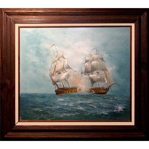 AN ORIGINAL OIL PAINTING OF FIGHTING GALLEONS ON THE HIGH SEAS<P>A superb original oil painting of two 19th century galleons at war on the high seas. The bright colors, composition and movement in this work all contribute to this painting as a great work of art. Cannons blaze and fire can be seen emanating from the cannons as these two imposing warships blast each other on the rough seas. Fire and water explode in an intense display between them as they seek to destroy each other on the open seas. <p>This painting is bordered by a beautifully decorated and textured solid wood frame, probably oak and of the period (Circa 1960's), and a thin inner fabric mat, along with its own thin wood moulding. Dimensions are 32" wide by 28" high, and condition of both the painting and frame is excellent. It is signed by the artist at the lower right, 'Bolttie'?.