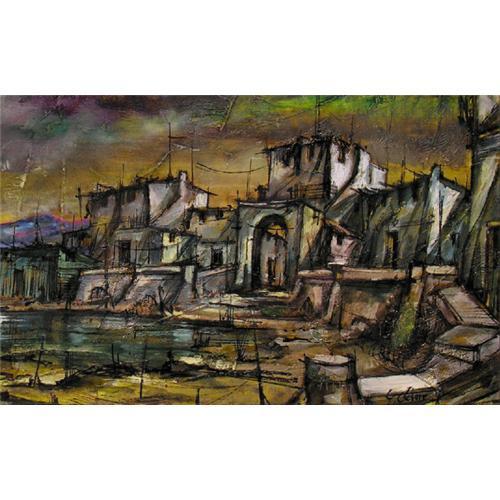 A HIGHLY ATTRACTIVE ORIGINAL OIL PAINTING IN THE CUBIST STYLE OF GEORGES BRAQUE AND PABLO PICASSO OF A MEDITERRANEAN COASTAL VILLAGE. </em></td>