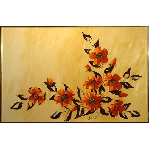 AN ORIGINAL OIL PAINTING OF A GROUPING OF MARIGOLD FLOWERS<P>A bold and lovely original painting by California artist Stephanie depicting a grouping of unusual bright orange marigolds on a pleasing sand-colored ground. From the artist's bio, "each painting Stephanie creates combines color and texture with design to achieve a joyful expression of nature. There is an oriental balance in her use of negative space that gives an airy feeling of harmony to all her work. There is a bold freshness in each carefully applied stroke. She has won numerous awards for her unique style. This talented professional has exhibited her work in more than 40 major cities while touring the United States in recent years. Prior to this she traveled extensively in both Europe and the Far East. She has collectors worldwide - in Great Britain, Canada, Japan, Austria, West Germany, and South America. She has been recognized and registered with the national Museum and Gallery Registration Association."<p>Dimensions are 36.25" wide by 24.25" high, and condition of this painting is excellent. The frame is thin gilt metal, and the painting was done circa the 1980's in oils on board. The artist's signature appears at lower right center.