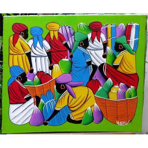 AN ORIGINAL OIL PAINTING FROM HAITI OF LADIES AT MARKET<P><BR>A Haitian painting of eight women, standing and seated, in typically Haitian brightly-colored outfits. They are surrounded by textiles and goods in a crowded marketplace. The painting is crisply delineated on a bright green background, with a color scheme of blue, red, green, white and purple, and is signed by the artist at the lower right, 'Andre'. Dimensions are 24" wide by 20" high, and this painting is unframed but stretched on a handmade wood framework. Condition is excellent, and the piece is contemporary.