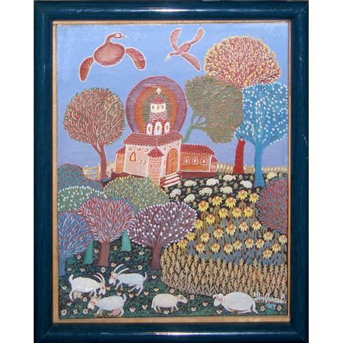 AN ORIGINAL SIGNED OIL PAINTING FROM HUNGARY IN THE NAIVE OR PRIMITIVE STYLE <p>A charming primitive style painting from Hungary of a small farmyard with sheep, goats, flowers, and trees in the modified childlike perspective of the naive art form. The garden in the foreground leads the eye of the viewer to a church and school surrounded by trees, with a pair of geese circling lazily above in a clear blue sky. The idyllic scene is painted in a attractive palette of light, childhood-memory evoking colors. <p>The painting is signed by the artist at lower right and dated 1984. It is bordered by a complementary blue lacquered wood frame. Dimensions are 11.4" high by 9.5" wide, and is in excellent condition.