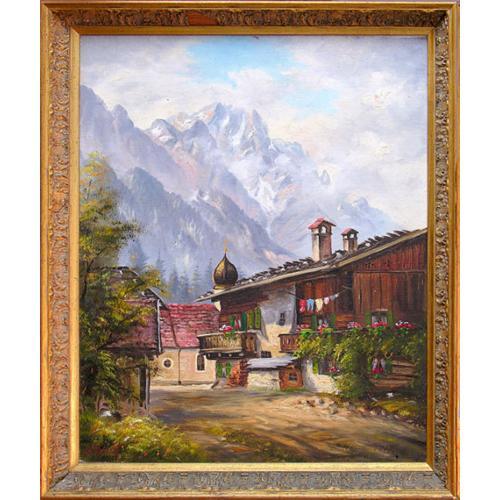 AN ORIGINAL OIL PAINTING OF A ZUGSPITZE MOUNTAINSCAPE <P>A lovely landscape scene of the famous mountain Zugspitze in the Bavarian Alps. The mountain is seen from the small rustic village Lermoos at its base. Beautiful natural atmospheric colors are visible, giving the mountain pastel hues of pinks and blues. A house in the village appears in the foreground with a tree and road. <p>The artist's signature, 'Schmidt' appears at lower left. This is a German artist who created this painting circa the 1950's or 1960's. Dimensions are 22 inches high by 18.1 inches wide. Condition is excellent, except for some minor damage to the top of the decorated period gilt wood frame.