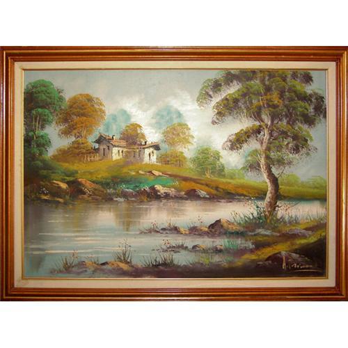 AN ORIGINAL LANDSCAPE OIL PAINTING OF A STREAM AND COTTAGE<P>A decorative and beautifully composed original autumn landscape painting of a gentle stream passing through a homestead, with a cottage set among trees on one of its banks. Several of the trees are in the process of changing colors with the onset of fall, and the naturescape is filled with subdued color. Bright clouds fill the sky, and boulders surrounded by flowers fill the stream, all of which gives the viewer a sense of peace found in the country. <p> Dimensions of this larger than average painting are 41" wide by 29" high. It is bordered by a gilt wood frame with inner fabric mat, as well as another innermost thin gilt wood moulding. The painting has some minor professional restorations to the canvas which are only visible from the reverse. some minor typical wear to the frame due to age is also apparent. Additional photos are available upon request. The artist has signed this work at lower right, 'A. D'Arnon?', and the piece was created circa the 1970's.