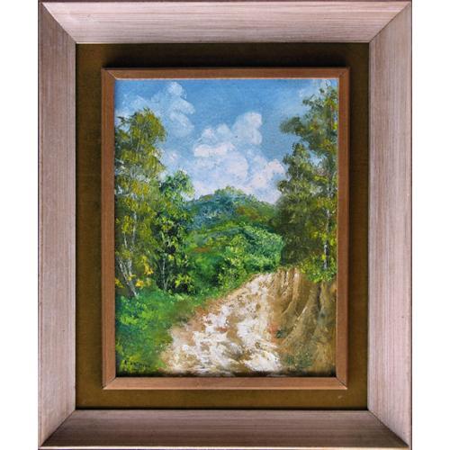 AN ORIGINAL OIL PAINTING OF A NATURESCAPE WITH DIRT ROAD<P>An attractive naturescape through hilly terrain. The viewer's eye is drawn down the dirt road, the main focal point in this painting, which is cut from the side of a mountain. The road winds around a curve with forest on both sides, leading the traveler's eye ultimately to a mountain in the distance. Some cumulus clouds in a blue sky can be seen above the mountain. <p>The artist has signed this painting at the lower left, 'Contreras '76'. Composition is well done, and the condition is excellent. The work is done on canvas and backed by plywood. The piece is attractively double framed, the inner frame colored a medium brown and relatively thin. The outer wood frame is of a lighter wood patina, with a medium brown velvet mat over wood in between the two. Dimensions are about 23.4 inches high by 19.5 inches wide.