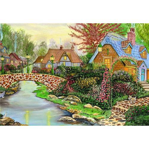 <p>A charming painting of a warm and cheerful fairy-tale village filled with flowers, the colorful scene showing several cottages, smoke rising from their chimneys, and a walking bridge of stones under which a small stream with grassy banks meanders. A small terrier watches from the steps of one of the cottages, through the windows of which one can see warm lights. Street lamps reflect in the water of the stream, and trees form the backdrop. <P>This original painting by an emerging artist is signed at lower right, 'Osverdi 2000', and is done on canvas board. The painting is unframed. Condition is excellent. This painting would make an inspiring addition to an artistic child's room.