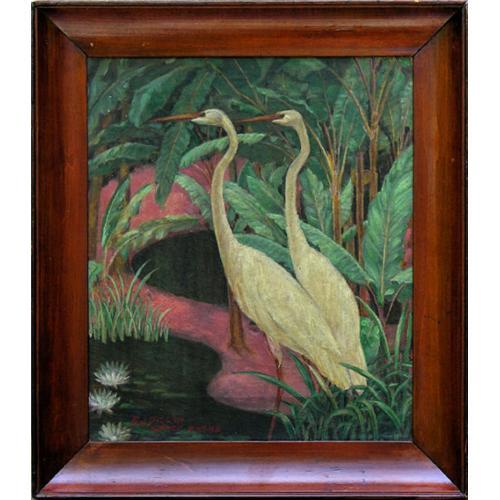 A decorative painting of a pair of white ibis standing in a pond in a tropical garden, among a group of banana trees. Water lilies can be seen in the pond foreground at lower left, along with water grasses. The canvas is framed in wood, patinated with a reddish-brown finish. There are minor imperfections to the wood frame due to age, and a very small tear in the canvas in the pink area beneath one of the bird's breasts (see photo). The artist's signature appears at lower left with an annotation, 'F.J. Dillon, after Botke'. Age is mid-20th century, and dimensions are 17.75 inches high by 15.6 inches wide.