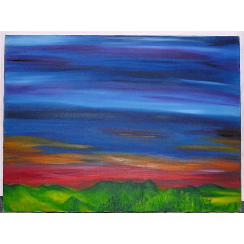 AN ORIGINAL OIL PAINTING OF A SKYSCAPE AND ROLLING HILLS AT DAWN <P><BR>A lovely scene of a multi-hued sky over rolling hills of green and yellow streching into the horizon. The early morning hours just before sunrise, the sky blazes with brilliant colors of reds an oranges at the horizon, while the sky overhead heralds the dawning of a new day with deep shades of blues and violets. As the rolling hills fade into the distance, bright fields of yellow and green give this painting a dreamy feeling of excape to a place far away. <p>The work is signed at the lower right by the artist, 'M. Frey '85'. Dimensions are 18" high by 24" wide, and this painting is unframed. Condition is very good.