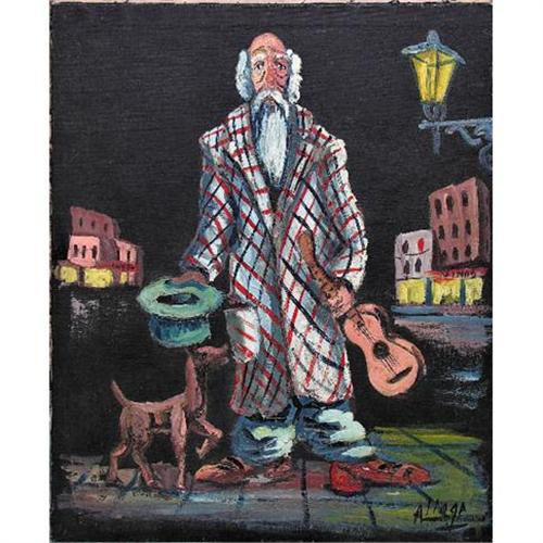 A lovely expressionist painting of a street musician (or busker) standing on a corner sidewalk. He holds his right hand out, entreating the viewer and passersby to tip him for his music after he has played. His guitar is in his left hand, and he wears a long black and red cross-striped overcoat with oversized pants and shoes. He has a long white beard and hair on the sides of his head, though he is balding on the top. Certainly the observer is able to sympathize with his plight and the struggles in his life. The artist has beautifully captured the plaintive emotional expression on this man's face as he asks for money, with a thick impasto painting brush style which emphasizes the hard life he lives. The scene is set against a black night sky, illuminated by a lone street lamp, perhaps reflecting the mood or state of mind of the subject. In the distance can be seen two structures. The one on the left reads, 'COMIDA' (FOOD), and the one on the right reads, 'VINOS', (WINES). His dog stands at his feet awaiting a treat or a walk. The scene probably takes place somewhere in Central or South America. <p>
