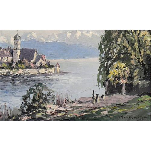 AN ORIGINAL OIL PAINTING OF A BAVARIAN ISLAND CASTLE<p>