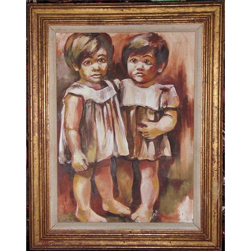 <table width="100%" border="0" cellspacing="0" cellpadding="4"><tr><td><em> AN ORIGINAL OIL PAINTING PORTRAIT IN SHADES OF BROWN OF TWO BABY SISTERS</em></td></tr><tr> <td width="100%"> AN OIL PAINTING PORTRAIT OF TWO BABY SISTERS<p>A very sweet portrait of two baby sisters in a sepia palette of colors in an attractive gilt-wood frame. The artist's signature, 'Snow', with the date '1968', appears at the lower right. The frame dimensions are 28" high by 22" wide, and the image dimensions are 21.25" high by 15.5" wide. Condition is very good to excellent. </td></tr><tr> <td> </td></tr><tr> <td>Reference #: 82904_3</td></tr><tr><td>Condition:Excellent</td></tr><tr><td>Year:1968</td></tr><tr><td>Country:America</td></tr><tr><td>Height:28" Frame; 21.25" Image</td></tr><tr><td>Width:22" Frame; 15.5" Image</td></tr><tr><td>Title:ORIG OIL PAINTING OF TWO BABY SISTERS</td></tr><tr><td>Materials:Oil on Canvas</td></tr><tr><td>Location:Miami, Florida</td></tr></table>