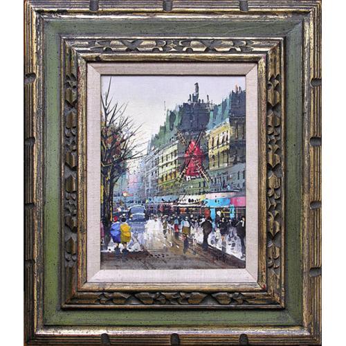 AN ORIGINAL OIL PAINTING OF A PARIS STREET SCENE IN FRONT OF THE MOULIN ROUGE<p>A lovely and very colorful oil painting of Paris in the 1960's. Throngs of people stroll down the street in front of the Moulin Rouge cabaret on a chilly late winter or springtime day. Trees on the left can be seen with their first flower buds, while some snow remains on the ground, and the pedestrians still wear their winter attire. A streetcar can be seen approaching the viewer, and the many colors of bustling Paris life are everywhere in this charming painting. <p>The artist's signature appears at the lower right, 'Fars'. He was an Italian artist living in Paris at the time of this painting's creation (the early 1960's). An attached short statement appears on the reverse: 'A wealthy patron of the arts and fellow townsman of CHRISTOPHER FARS has sponsored this talented young man's education for the past five years. Presently in Paris, completing his studies, FARS is proud of the fact that his canvases are being sold across the Atlantic Ocean. He is due to return to his native Florence in the summer of 1966.' <p>Dimensions of this work are 20.9 inches high by 18 inches wide. The frame is highly decorated carved and gilt wood, with an inner canvas mat. Condition of both the painting and the frame are excellent.