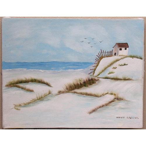 A charming seascape oil painting in the primitive style of a fenced beach house or shack on top of a sand dune, with beach grasses, a flock of seagulls, and a view of the ocean. The setting appears to be the northeast coast of the U.S., perhaps Cape Cod. The painting is unframed but stretched on wood, and is signed by the artist at the lower right, 'Alezse S. Faircloth'. Dimensions are 14" high by 18" wide, and the piece is in very good condition.
