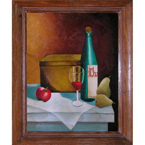 A decorative still life oil painting on canvas board of a bottle of wine, an apple, two pears, a half-filled glass of wine, and a mysterious covered box in the background, all resting on a linen-covered table. The image is painted in realistic colors, with background wall in a gradient of browns. Note that the tablecloth and table are slightly stained, as if some food or wine spilled on them. This may or may not be the intention of the artist, but the painting is priced accordingly nonetheless (see photos). Overall dimensions are 24" high by 20" wide, and the painting is framed in honey-colored oak wood, with only minor blemishes to the frame. It is signed at lower left by the artist, 'M. Pratt, 1978'.