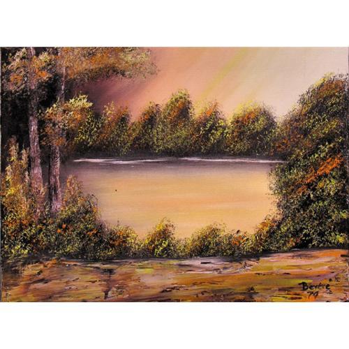 AN ORIGINAL OIL PAINTING OF A SUNSET WITH POND AND TREES
