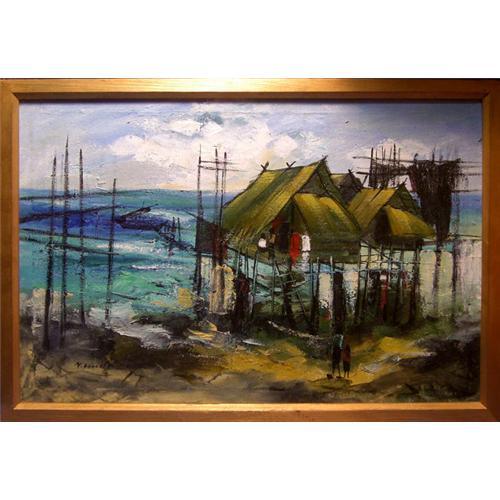 AN ORIGINAL PAINTING OF A SEASIDE STILT COMMUNITY IN THAILAND<p> A very unusual original painting of a group of seaside habitations along the coast of Thailand. The primary living quarters are large tents, constructed using a framework of stilts to keep the dwellings above the ocean and waves, and to allow small boats to be docked underneath. Two people can be seen in the largest tent with textiles hanging from the railings. Two others stand on the beach as waves roll in. The artist has used a pleasing impressionistic pattern of strong brushstrokes to create the seascape scene, with an attractive bold color palette to portray the cloudy skies and beachscape. <p> Dimensions are 17.5" high by 25.4" wide, and the painting is in excellent condition for its age. It is bordered by a gilt wood frame with only minor blemishes due to age. The artist has signed this work at lower left, with an inscription in ink on the reverse that reads, 'Donna Lasla, Thailand', along with a short phrase, apparently in Thai, perhaps identifying the location.