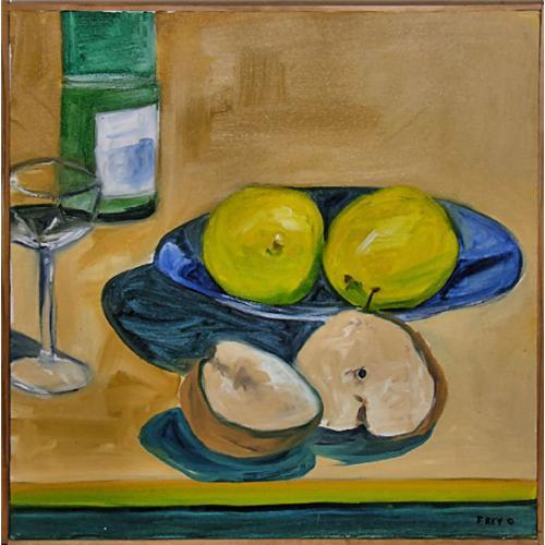 <P>An original still life painting of pears and wine; two yellow pears in a blue plate, one bosc pear cut in half on the table, and to the left a bottle and glass of wine, all on a light brown ground. Condition is excellent, and dimensions of this painting are 20.75" high by 20.25" wide. The artist, Mark Frey, a Tampa, Florida, artist has signed this painting at lower right, 'Frey'; the date and artist's name appear on the reverse, 'M. Frey 2003'.