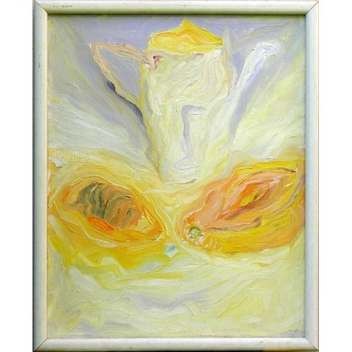 An interesting abstract painting of swirling lines and forms in a color palette of white, yellows, oranges and lavender-grays. Overall dimensions of the painting are 21.15" high by 17.25" wide. It is signed on the reverse of the canvas, 'Dori N. Groves, 1983'. The painting is in a white wood frame and is in very condition. Additional photos are available upon request.
