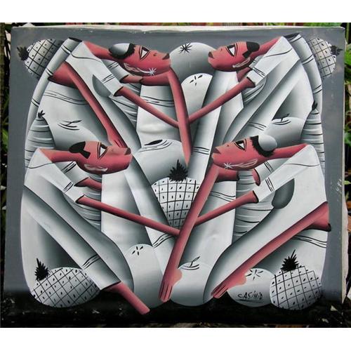 An interesting and charming painting in acrylics on canvas of two couples in the Bahama Islands with pineapples and other fruit. The people are depicted in a kind of endearing abstract expressionistic way characteristic of the Bahamian culture. The unusual color palette is made up of shades of gray, pink and white. The piece is signed at the lower right by the well-know Haitian artist, 'Casimir', under which the artist has also written, 'Bahamas'. <p>The piece is unframed and stretched on improvised homemade scrap wood, as it is expensive and difficult for local artists to purchase finished art supplies in the islands. The overall condition of the painting is good, but there is some minor rubbing around the edges of the painting, which would be covered by an appropriate frame (see photos). Dimensions are 20.6" high by 23.5" wide.