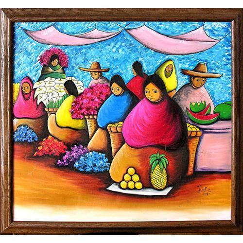A brightly colored, charming original painting of a fruit and flower market. The local folk, wrapped in bright, multi-colored blankets, sit contentedly with smiles on their faces and await customers for their pineapples, oranges, watermelons, calla lilies, and other flowers. Hammocks hang in the background against a blue sky. <p>This painting is signed by the artist at the lower right, 'Jortiz '94', and is in excellent condition. It is framed in an attractive oak frame. Overall size is 35" high by 31" wide.