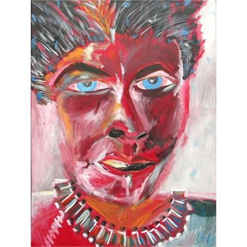 AN ORIGINAL PAINTING BY AN INDIGENOUS NATIVE BRAZILIAN INDIAN<P>A large and powerful original portrait painting of a Brazilian Indian in native dress, by an indigenous indian artist of the same tribe. The portrait is a striking and strong statement of the personality of this subject, captured by the artist in the unblinking stare of the subject's sky-blue eyes, which seem to pierce the viewer's very being with their intensity. The painted face and wild hair, along with the bright blue eyes and exciting intensity of the color palette employed, make this portrait a rare and highly interesting work of art. <p>The collector from whom this painting was purchased acquired it from the original artist on an exploratory trip to the countryside outside of Rio de Janeiro, Brazil. It was done in the last quarter of the 20th century. Dimensions are over 4 feet in height by 3 feet in width by 1.5 inches in depth, a rather large painting. The painting is unframed, with the canvas on a strong wood stretcher. The condition is excellent.