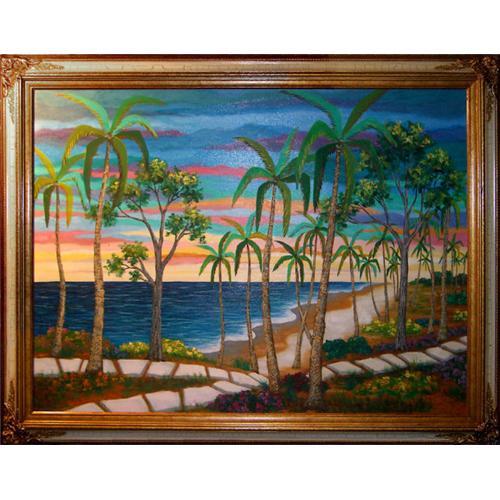 AN ORIGINAL PAINTING OF A TROPICAL ISLAND GARDEN AND BEACHSCAPE <P>A massive original acrylic painting of a tropical island garden and seascape. The image is filled with coconut palms and flowering trees. As the viewer stands on a hillside and gazes towards the ocean, the eye moves along a stone slab pathway leading down to a beach and the ocean. On either side of the pathway are flower groupings of several colors. The sky is a Caribbean candy-colored fantasy of tropical hues, from sunset oranges and pinks to blues and violets. <p>This is a very large painting, with dimensions of 55.5" wide by 43.5" high. It is in excellent condition, with a highly decorated gilt wood frame containing a central crackled white lacquer finish. It appears to have been painted circa the 1990's. This painting would give a stunning tropical island feeling to a Florida room or porch area. Please note that due to its large size, shipping and packing fees will be greater than usual outside the South Florida area.