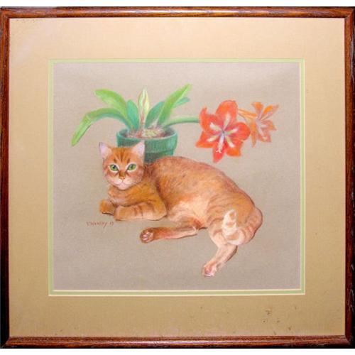 AN ORIGINAL PASTEL PAINTING OF A CAT<p>An attractive portrait in pastels of a cat with nicely detailed orange fur. The feline is shown in a reclining position and stares straight at the viewer with bright green eyes. Behind its back is a potted Dutch amaryllis with two orange blossoms and one bud, complementing the color of the cat and enhancing the composition of the painting. The tail seems almost to be in motion in characteristic cat fashion. <p>The artist has signed this portrait below the forepaws, 'V. Weakley '87'. Dimensions are about 20.75 inches high by 22.5 inches wide. The piece is under glass, double-matted with light green and beige colors, and bordered by an oak frame. Condition is excellent,with some minor dust or debris under the glass near the bottom.