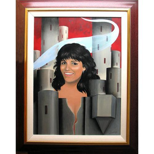 This is a very large portrait painting of lovely Latin lady named Charlotte. The artist, whose signature appears at the lower right of the painting, is a well known artist living in Miami. He paints this subject in an unusual and original manner, with her emerging and smiling as the centerpiece of, and surrounded by, a mythical or futuristic stylized cityscape with maroon sky. Her personality is vibrant and clearly evident in her facial expression. <p>Quite large at 51.5 inches high and 41.5 inches wide, the painting is beautifully framed in a dark reddish-brown finished wood, with white canvas matting and gold trim. It is in excellent condition, with only very minor blemishes to the wood of the frame due to age.