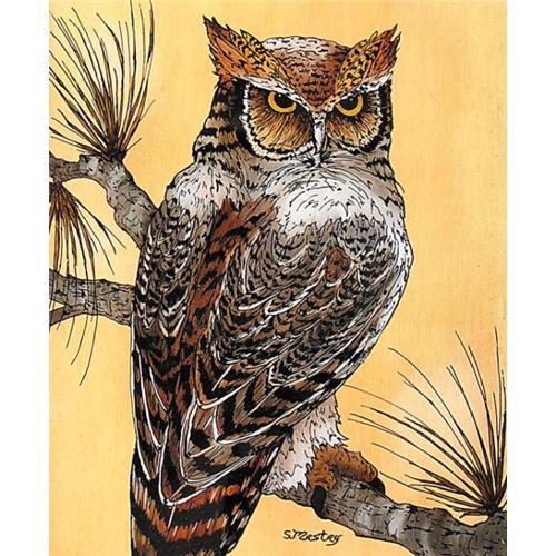 AN ORIGINAL REVERSE PAINTING ON GLASS OF AN OWL<p>A realistic and beautiful original painting of an owl sitting on the branch of a pine tree. The feathers are finely detailed, with the bird's colors in realistic browns and grays. The owl faces away from the viewer as it sits on the branch, but has its head turned almost completely around, in characteristic fashion, to face the observer with an equally characteristic intense stare. The brushstrokes are beautifully executed, as is the shading in the tree branch and the bird itself. The background is of a peach color.<p>The artist's signature appears at bottom center, 'S. Mastry'. Dimensions are 17.1 inches high by 14 inches wide. Condition is excellent, and the ornately grooved, dark wood frame with burlap mat and inner wood border beautifully matches the image on glass.