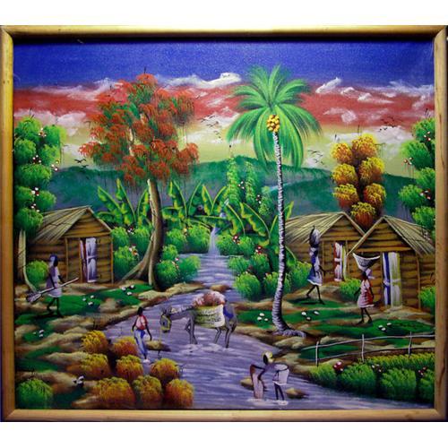 AN ORIGINAL SIGNED HAITIAN PAINTING OF A COUNTRY VILLAGE AND NATURESCAPE<p>A stream meanders through the rural landscape, and thatched cabins line its banks amid lush tropical flora in this colorful naturescape. Villagers go about their daily activities, washing clothing in the stream, walking a pack mule across the stream, carrying baskets on their heads, etc. Central focal points are a royal poinciana tree in full bloom and a tall coconut palm tree, among other trees. As the viewer's eye follows the stream as it recedes into the distance, a waterfall appears through a banana tree grove. In the far distance is a mountain ridge under sunset-hued skies. <p>The artist's signature appears at the lower right. Condition is excellent, and this painting is framed in rounded, solid unfinished wood. Dimensions are 21" high by 23.5" wide, and was created circa the 1990's.
