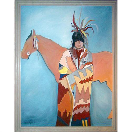 AN ORIGINAL SIGNED LARGE ACRYLIC PAINTING OF A NATIVE AMERICAN INDIAN<p>A large and attractive original acrylic stylized portrait painting of a native American Indian. He is standing, and wrapped around his shoulders is what appears to be a Navaho woven blanket. He wears a black mask through which he peers at the observer with red eyes. He also wears a multi-colored feathered headdress. His arms are crossed under the blanket, and his stance conveys a sense of power and authority. His horse, with feathers hanging from its ear, stands behind him. This work of art is painted in a palette of desert colors typical of the American West, on a light sky blue background. It is signed and dated at the lower left, 'C. Milligan, '93', a Miami artist. Condition is excellent, with almost imperceptible wear to the frame. Dimensions are 52.25 inches high by 40.35 inches wide.