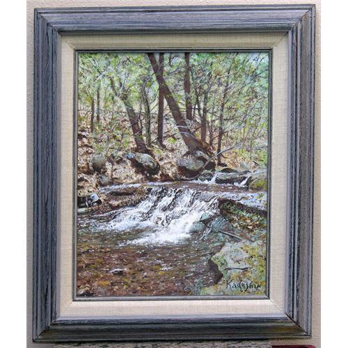 A lovely painting of a stream in a forest, with a small whitewater waterfall as the central focal point of the painting. River rocks can be seen at the bottom of the stream, and large boulders rest at the base of a hillside. The entire scene is reminiscent perhaps of an early springtime in the North Carolina woods. Condition of the painting is excellent. Overall dimensions are 18.75" high by 15.75" wide. The painting is signed by the artist at the lower right, 'Kadushin', a relatively well-known artist who worked in the Miami, Florida, area. She reportedly died in that area about 20 years ago.