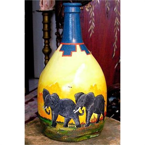 <p>This rare and uniquely original hand painting on a bottle depicts four elephants in a procession walking through the African savanna. Some birds and flowers appear in the scene as well. The elephants are in natural gray color with a background of grass and some trees and bushes in the distance, all against a sky of brilliant shades of the yellows and oranges of the African sunset. The neck of the bottle is decorated in a blue geometric pattern with red border. The signature of the artist appears at the foot and reads, 'R Lion Molina'. Condition is excellent, and this bottle was probably painted in America. Height is 12" and diameter is 6.25".