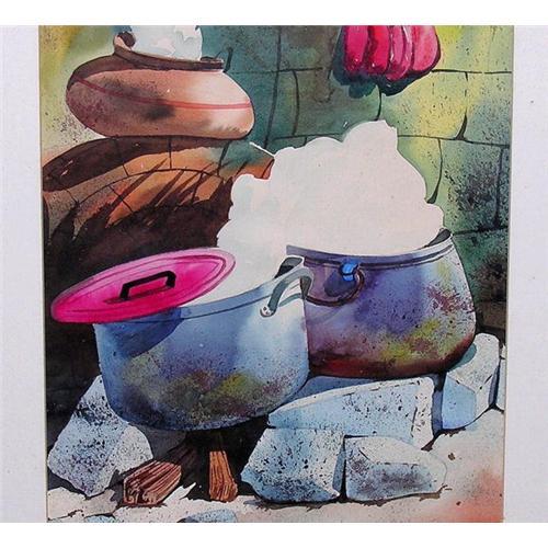 A very colorful and unusual still life painting in shades of blues, browns and reds by a well-known watercolor artist in Peru. This well-executed painting depicts a brick oven hearth, in front of which is an open, makeshift wood-burning cooking fire, upon which sit two large, steaming pots of food; a third pot sits on the brick oven wall, all of which await the cook to come and serve dinner. <p>