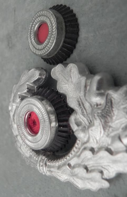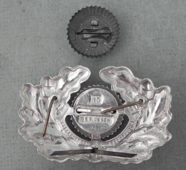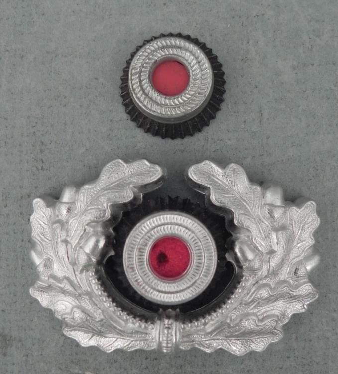 ORIG WEHRMACHT COCKADE & WREATH-MINT & EXTRA COCKADEALL ORIGINAL & MINT--WREATH & COICKADE IS ONE PIECE AND MARKED "GES GESCH AND 15 (MAKER)"--TINY MOTH NIP ON RED WOOL CENTER--2ND COCKADE WITH WOOL CENTER IS FINE