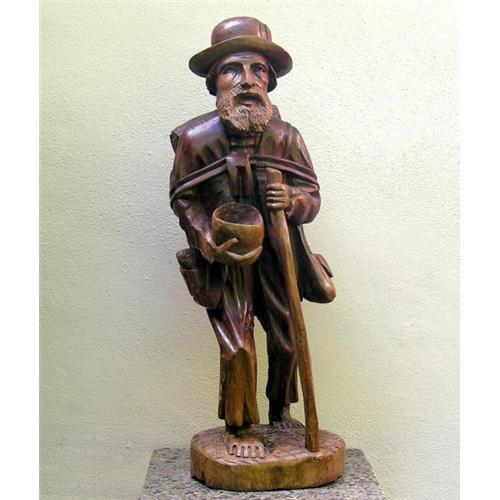A charming character study of a bearded man with hat and walking stick making his way through the Colombian countryside. His mouth is open as he struggles to catch his breath under his heavy burden. He carries a heavy load of four large bundles on his back, as he wearily trudges to his destination. In his right hand, he holds an empty bowl, and on his right side he wears a covered pouch. The lines and expression in his face and his bent knees portray a hard life for this man as he stares into the distance on his journey. This folk sculpture is carved from a single piece of wood, and shows only minor wear and natural defects in the wood from age. It is unsigned, as is typical of South American folk sculpture of this type. Dimensions are approximately 23.5" high by 9" wide.