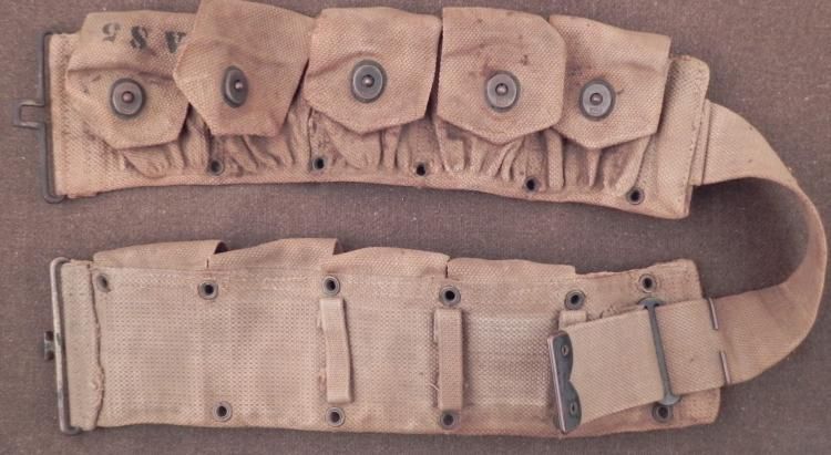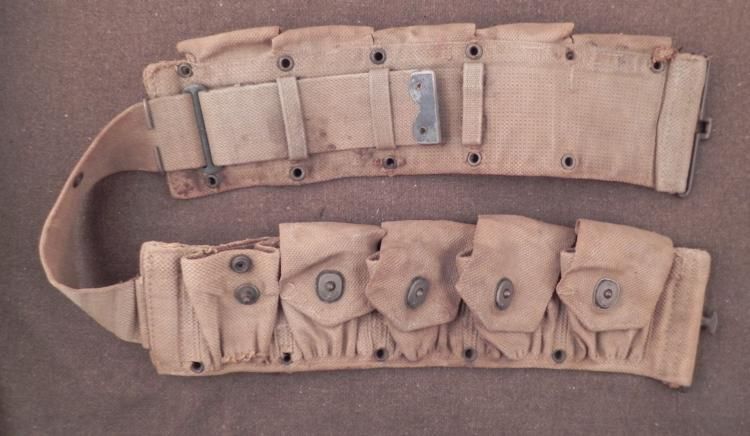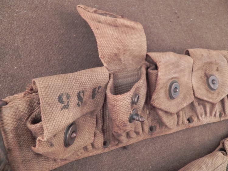 ORIG WWI 10 POUCH AMMO BELT-MKD "AS5"- BRASS HARDWARE-TAN CANVAS * SHOWS COMBAT WEAR--1 POUCH FLAP NOT PRESENT *