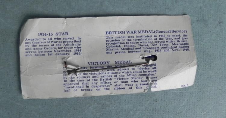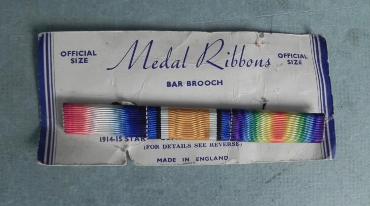ORIG WWI RIBBON BAR-MADE IN ENGLAND ON ORIG CARD-1914-15 STAR-GEN SERVICE-VICTORY RIBBON INCLUDES 1914-15 STAR-GENERAL SERVICE AND VICTORY MEDAL