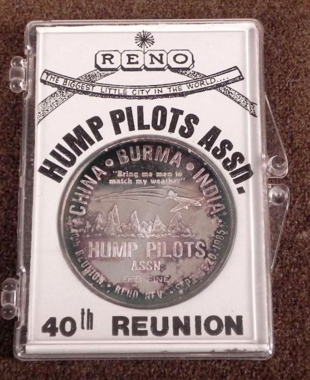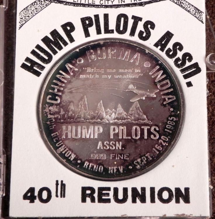 ORIGINAL * WWII CBI "HUMP PILOTS" .999 SILVER 40TH REUNION COIN W/PILOT'S * STORY FROM HUMP PILOT ASSN BOOK * * 1 * 1/2" SILVER .999 HUMP PILOT'S 40TH REUNION IN RENO IN 1985--ALSO * INCLUDES COPY OF PILOT'S HISTORY & BOOK COVER-GUARANTEED FROM PILOT & * ORIGINAL