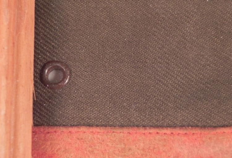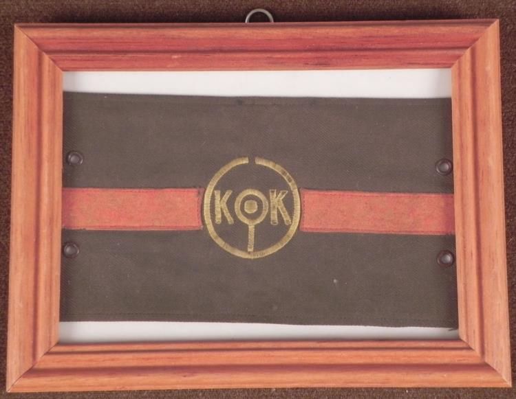 ORIGINAL WWII JAPANESE ARMY ARMBAND FOR MASTER SHARPSHOOTER INSTRUCTOR IN FRAME * GI CAPTURED - GREEN WITH STRIPE-SHARPSHOOTER'S SCOPE IN CENTER WITH "KOK"--TWO GROMETS ON EACH SIDE-JAPANESE ARMBANDS WERE FASTENED WITH STRING THROUGH THE GROMETS, UNLIKE WRAP-AROUNDS THAT NAZIS AND US WORE. *