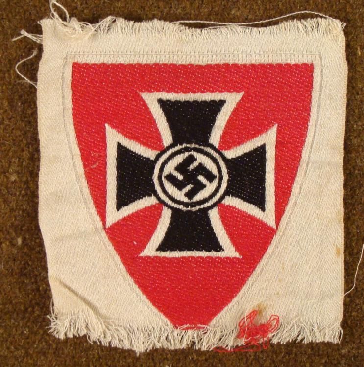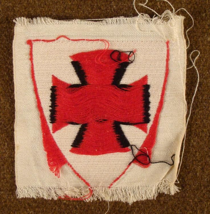 HERE IS AN ORIGINAL NAZI SLEEVE PATCH FOR UNIFORM. IT HAS A RED SHIELD WITH A BLACK IRON CROSS & BLACK SWASTIKA CENTER. THE PATCH HAS GREAT EMBROIDERY, WITH A SILK TYPE WHITE BORDER AND IS 2 3/4 X 3". *